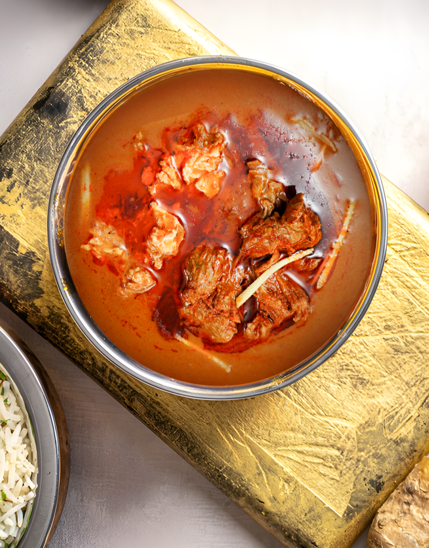 Nihari, our signature dish, features slow-cooked prime beef shank, infused with unique herbs and spices, medium spice level.